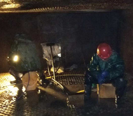 因2#鍋爐上下級空預器堵塞嚴重,無法滿足生產(chǎn)負荷要求,影響鍋爐正常運行,2019年1月14日9點30分,根據(jù)公司停車檢修計劃,對2#鍋爐空預器管進行清洗及疏通,首先在煙道底部制作排水口,引至地溝,保證現(xiàn)場路面無積水及結冰,待空預器內溫度下降,公司領導組織崗位人員輪流進入空預器清理積灰,為空預器管道清洗及疏通做好各項準備工作,15日正式使用清洗機對空預器進行帶壓清洗,所有人員不怕苦、不怕累、放棄休息時間協(xié)助外包人員及時疏通空預器堵塞管道,更換空預器套管,檢修人員雖然穿著厚厚的棉衣,但不一會也被寒冷打透。手凍僵了,他們搓了搓接著干。