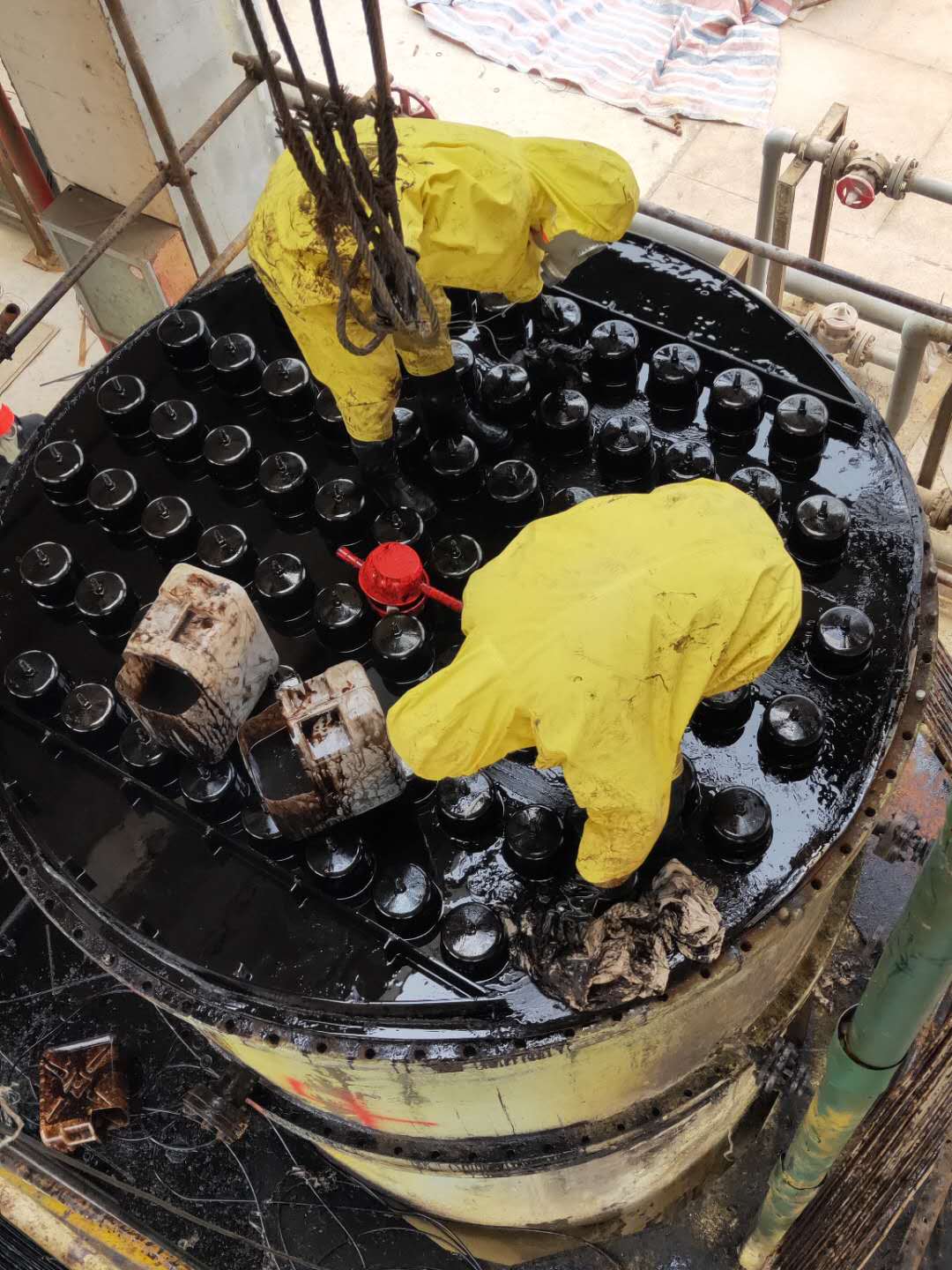 檢修現(xiàn)場(chǎng),新員工在摸索中不斷前進(jìn)大膽嘗試,在師傅的帶領(lǐng)下提高自身技能,相信這次檢修作業(yè)中他們會(huì)學(xué)到更多!在檢修期間,各裝置區(qū)對(duì)于施工現(xiàn)場(chǎng)布置可謂井井有條,忙而不亂,新員工協(xié)助老師傅開展工作,現(xiàn)場(chǎng)各類工量器具擺放整齊,信手拈來游刃有余,新舊棉紗分類,清洗油和廢油各有專用容器盛放,為快速、安全、高質(zhì)量檢修提供了有力保障。