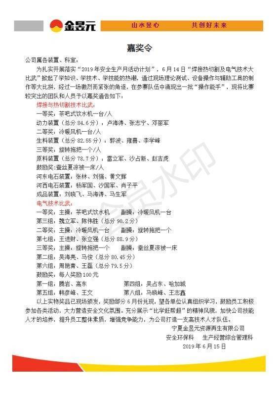 比賽結束后,公司對此次參加比賽的所有人員頒布了嘉獎令,鼓勵員工在今后的工作中提高操作水平,努力奮進,爭做優(yōu)秀員工!