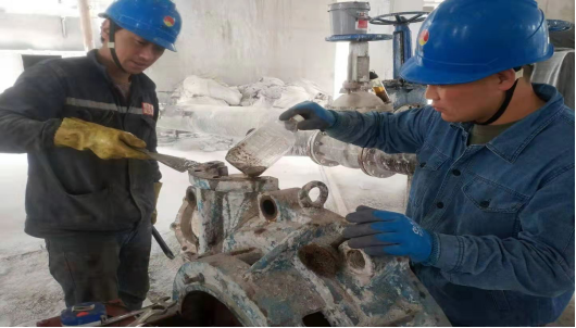 穿過馬路,步入公司核心生產(chǎn)區(qū)域。在生料裝置各個現(xiàn)場,1#號濃縮池底安裝渣漿泵,1#-16#刮板機下料口技改、堆料機1502皮帶硫化、循環(huán)風(fēng)機、尾排風(fēng)機、V選、混料機、輥壓機檢修的完成以及1102皮帶托輥檢查及軸承潤滑的進行。此時,在酷暑下,一個個精神充沛的工友們頂著烈日的酷曬,正聚精會神的進行著檢修作業(yè),他一只手扶著設(shè)備,一只手使勁的搬動著板子,那動作仿佛撫摸初生嬰兒的笑臉,那種眼神好似在說:孩子,你快成型了,等你成型組裝后,就會被帶動其他設(shè)備和諧運轉(zhuǎn)。他們是設(shè)備正常運轉(zhuǎn)的一個個信使,傳遞著安全生產(chǎn),減輕勞動強度,促進人們對公司健康發(fā)展的美好祝愿。