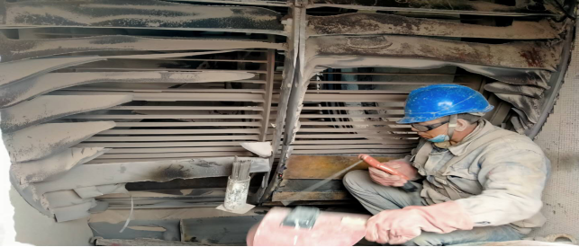 在回轉(zhuǎn)窯,做好更換窯磚前期準(zhǔn)備工作——清理深挖4米處窯皮、窯磚。