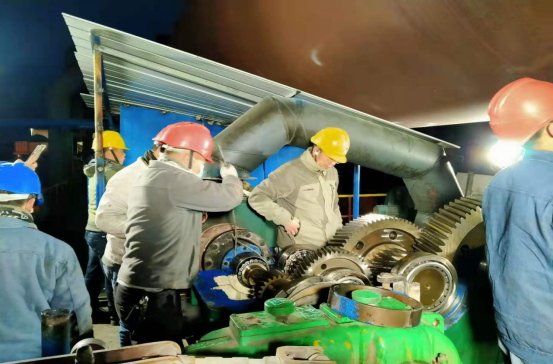 1月4日,塞北二九天氣,室外溫度已在零下16℃左右,傍晚夜幕降臨,員工們在燈火通明的回轉(zhuǎn)窯主減速機(jī)檢修現(xiàn)場(chǎng),迎著寒風(fēng)刺骨,卻是熱火朝天,一派繁忙大干的景象。由于生產(chǎn)任務(wù)重,檢修時(shí)間緊,公司領(lǐng)導(dǎo)班子帶領(lǐng)員工克服種種困難,戰(zhàn)勝諸多不利因素,不畏嚴(yán)寒,加班加點(diǎn)趕進(jìn)度,爭(zhēng)分奪秒搶工期,積極推進(jìn)回轉(zhuǎn)窯主減速機(jī)恢復(fù)正常運(yùn)行。