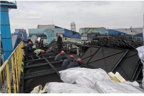 “兵分兩路,烈日前行”。5月22日早晨8:30,30多人開始在除塵系統(tǒng)頂部開始舊布袋和袋籠的拆除工作。“一個布袋長4.2米,全部堆到這兒,對平臺上的作業(yè)人員很不安全,我們還是把布袋疊好,放在大袋子中,這樣現(xiàn)場就不亂了!睅酌毠ぜ皶r規(guī)整舊布袋。