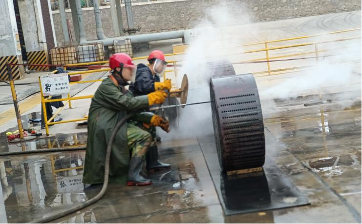 檢修已經(jīng)是第三天,接近尾聲,大家似乎已經(jīng)疲憊,但是行動上未松懈。今日的氯化氫小廣場上格外熱鬧,7:20,班長已經(jīng)開始準備今日的檢修票證,為檢修項目做準備。他的身影在朝陽地映射下顯得那么著急,沒有一點怠慢的意思,今天我們班組檢修的項目是提濃塔再沸器石墨塊疏通工作,這項工作看起來簡單,實際上是耐心地考驗。一個個細小的石墨孔需要用蒸汽一個一個疏通,檢修開始之前還是和往常一樣,安全教育是少不了的,班長一遍遍強調(diào)防護用品規(guī)范佩戴以及疏通過程中的安全注意事項,在準備工作結束后,今天的檢修工作開始了。