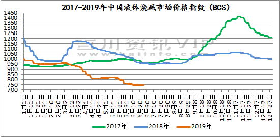 2019年中國液體燒堿整體走勢下行明顯,價格下滑至近三年來市場最低水平,下游需求整體較為疲軟,是今年國內(nèi)燒堿市場下行的主要原因。根據(jù)百川資訊跟蹤數(shù)據(jù),6月份國內(nèi)32%離子膜液堿市場平均價格在751元/噸,與1月份的平均水平966元/噸相比,降幅在22.26%;根據(jù)百川資訊跟蹤數(shù)據(jù),6月份國內(nèi)50%離子膜液堿市場平均價格在1300元/噸,與1月份的平均水平1607元/噸相比,降幅在19.10%。