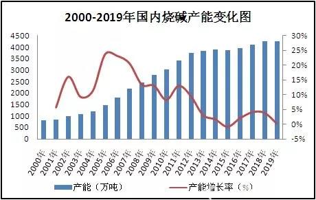 圖2 2000-2019年國內燒堿產(chǎn)能變化圖