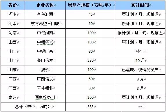 表1 2019年國內氧化鋁增復產(chǎn)統(tǒng)計(數(shù)據(jù)來源:東證期貨)