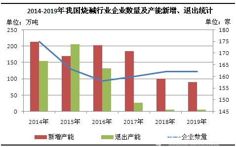 圖1 2014-2019年中國(guó)燒堿行業(yè)企業(yè)數(shù)量及產(chǎn)能新增、退出統(tǒng)計(jì)